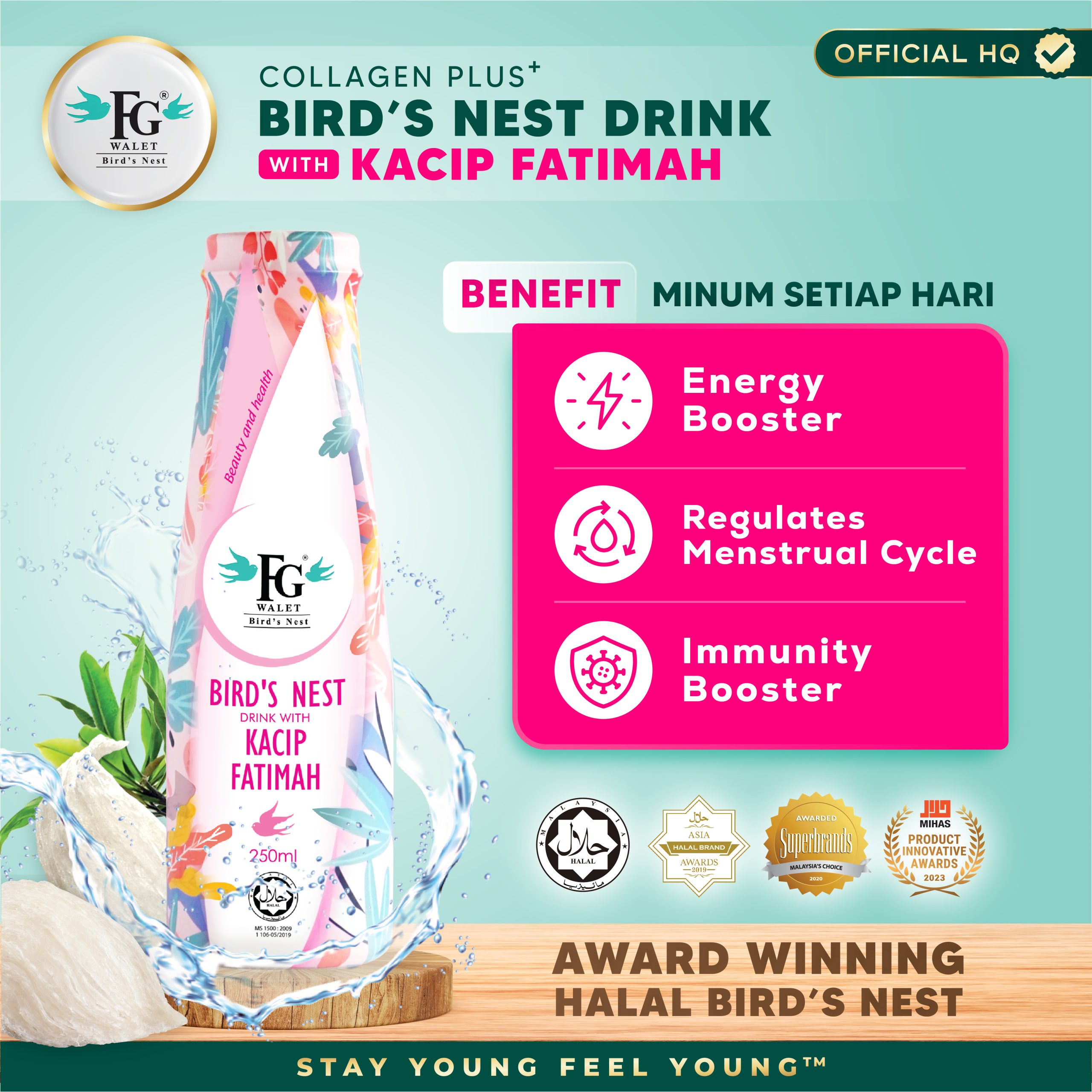 Using 100% pure Bird’s Nest mixed with Kacip Fatimah for an explosive experience of flavor and natural goodness.